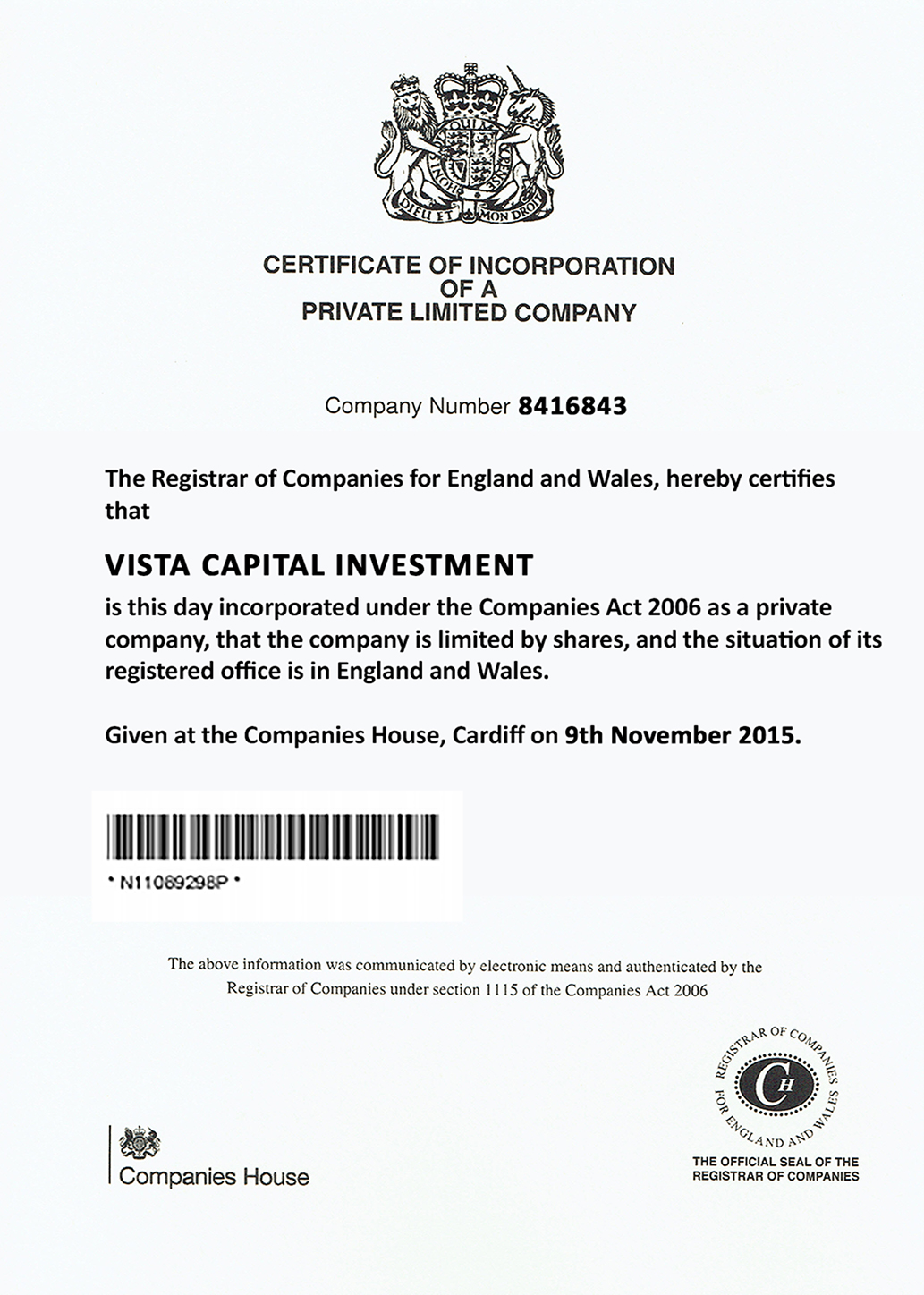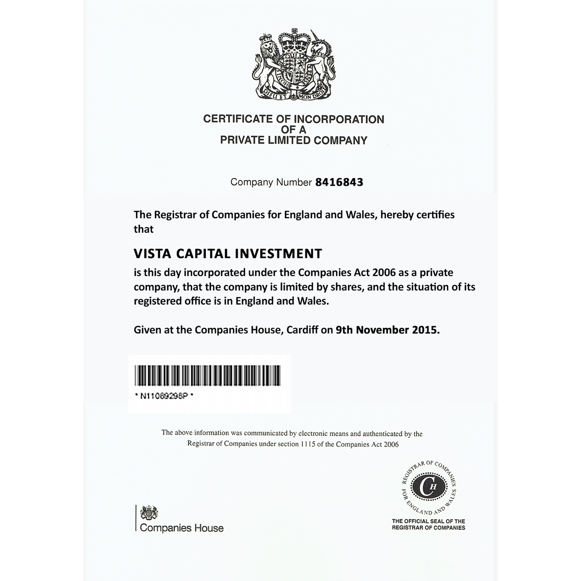 Vista Capital Invest is certified by the Registrar of Companies for England and